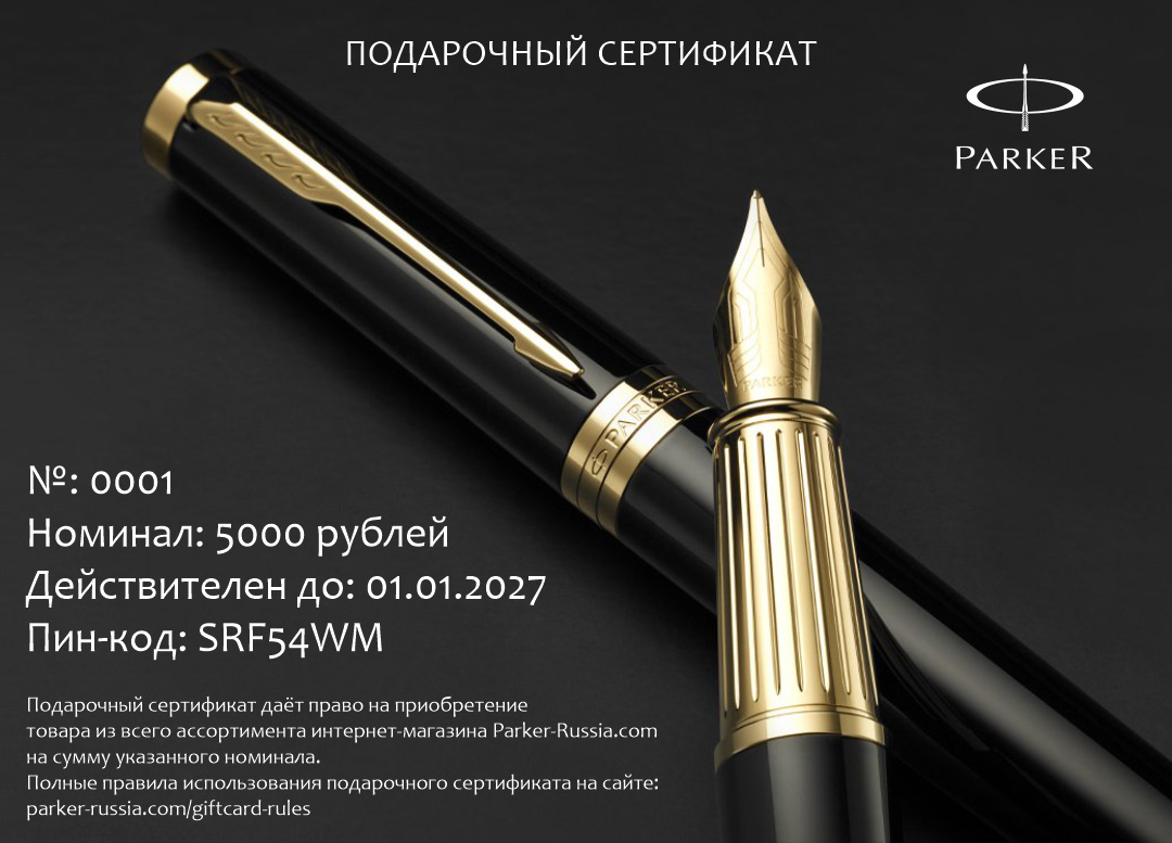 Подарочный сертификат Parker 7000 от официального дилера Parker в Екатеринбурге. Вы можете дополнительно заказать гравировку, которая подчеркнет Вашу оригинальность и придаст памятность статусному подарку. Все ручки Паркер поставляются в фирменном футляре.